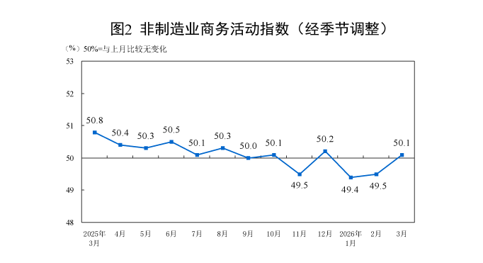 3月份,非制造业商务活动指数为50.1%,比上月上升0.6个百分点,高于临界点,非制造业景气水平有所改善。