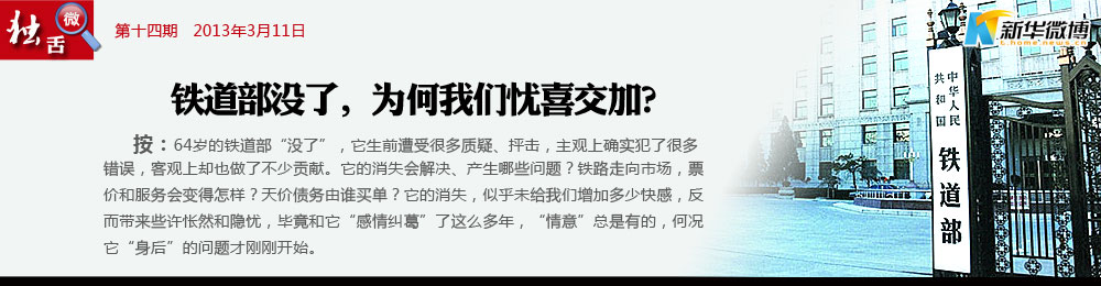 @秋水伊人:之前累積的債務(wù)問題如何解決?誰是還債主體?明年春運被“吐槽”的是誰?撤銷鐵道部體現(xiàn)了改革的決心,希望能有好的轉(zhuǎn)變。