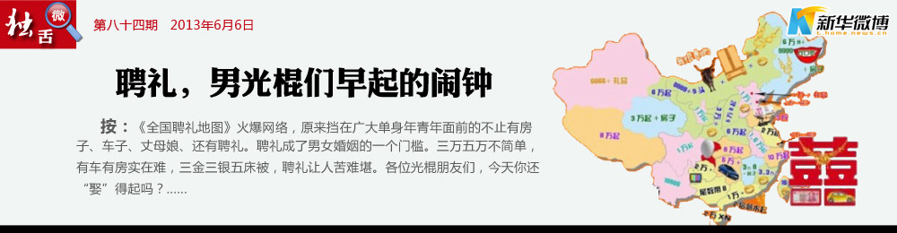 聘禮:敲醒青年男子們的警鐘 青年們,每天早晨叫醒你的不是鬧鐘,是娶妻聘禮!從五萬元淺水區(qū)到百萬元深水區(qū)不等, 各位騷年們,你們現在都在哪個區(qū)域裸泳?