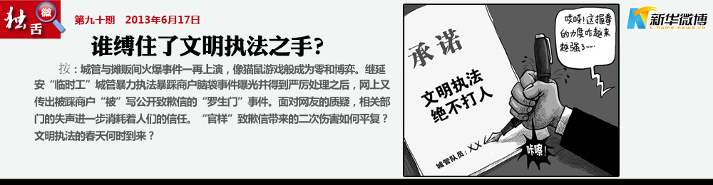 暴力執(zhí)法誰來負(fù)責(zé) 延安城管暴力執(zhí)法事件引來眾議,臨時(shí)工又“果然不出網(wǎng)民所料”地成為擋箭牌。什么叫臨時(shí)工?網(wǎng)友回答:負(fù)責(zé)提供“臨時(shí)性攻擊”、關(guān)鍵時(shí)刻隨時(shí)準(zhǔn)備替領(lǐng)導(dǎo)們頂罪的人。法律未賦權(quán)的人員本來就不具有執(zhí)法權(quán),這是法治應(yīng)有之義。