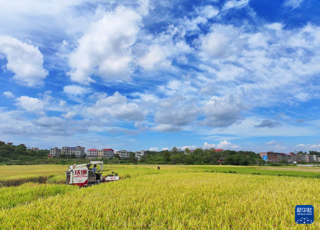 9月11日,湖南省衡阳市衡东县石滩乡村民驾驶农机收割稻谷(无人机照片)。