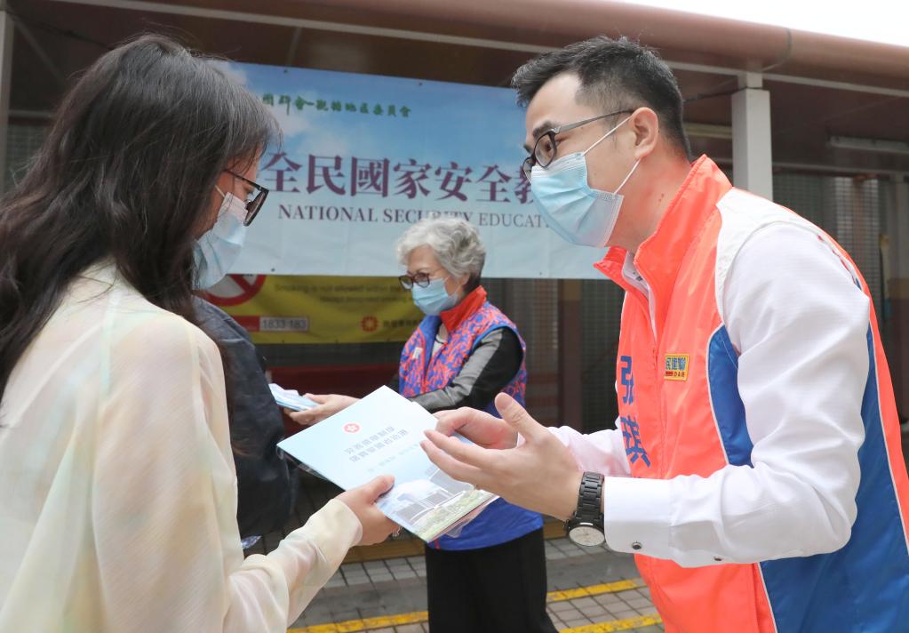 2021年4月15日,香港市民張琪騰(右)在全民國家安全教育日活動(dòng)上宣講國家安全理念。新華社記者 吳曉初 攝