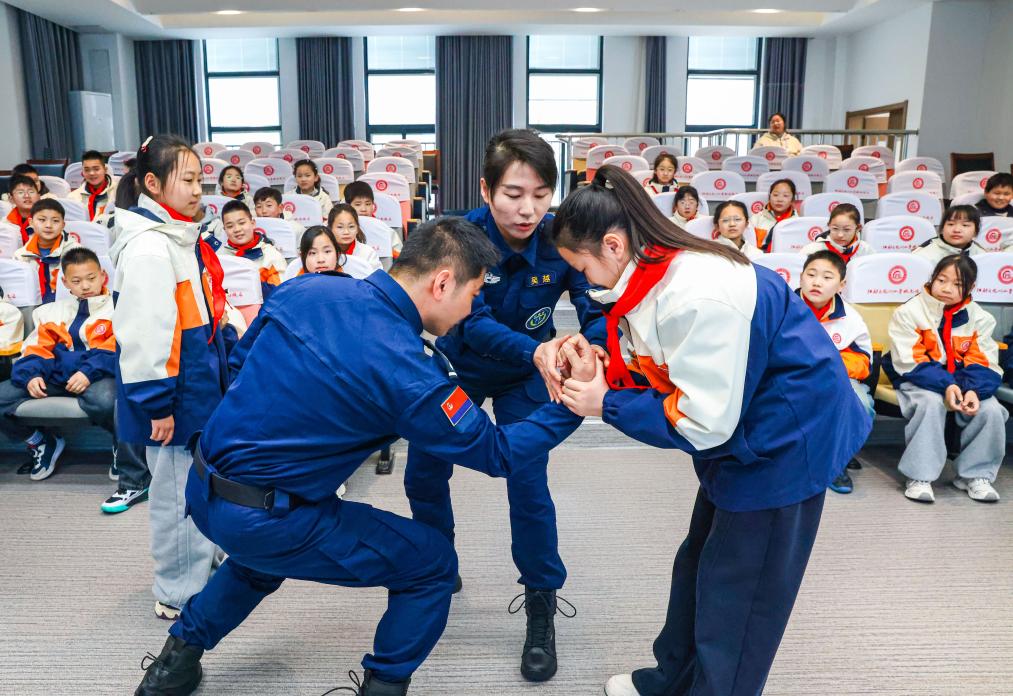 3月30日,消防员在贵州省开阳县第一小学指导学生演练溺水自救互救的基本技能。