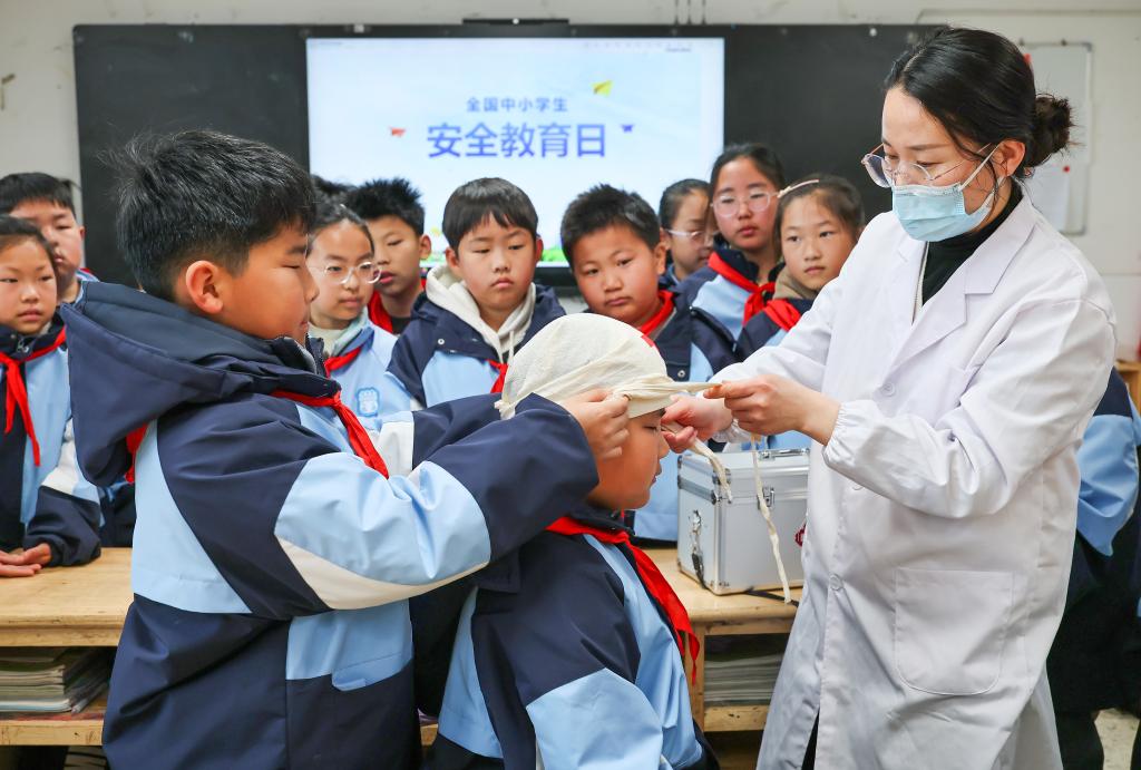 3月30日,在江苏省连云港市海州湾小学,医务人员在教小学生救护包扎方法。