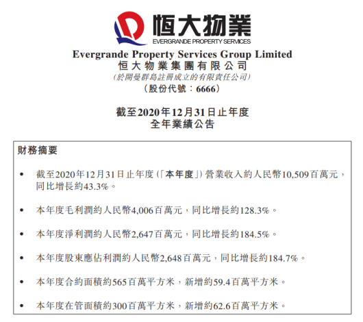 數(shù)據(jù)顯示,2020年恒大物業(yè)實現(xiàn)營業(yè)收入105.09億元,同比增43.31%;毛利潤40.06億元,同比增128.26%;凈利潤26.47億元,同比增184.32%;現(xiàn)金余額126.04億元,同比增1742.69%;合約面積達5.65億平方米,同比增長11.88%;在管面積達3億平方米,同比增長26.05%。