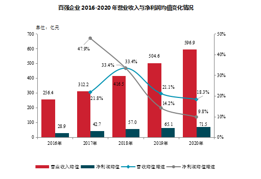 報告指出,百強企業(yè)營收與凈利潤保持增長態(tài)勢,盈利能力持續(xù)下行。百強企業(yè)銷售業(yè)績的穩(wěn)步增長帶動其營業(yè)收入和凈利潤的持續(xù)增加,2020年,百強企業(yè)營業(yè)收入均值達596.9億元,凈利潤均值達71.5億元,分別同比增長18.3%、9.8%,增速較上年減少2.8、4.4個百分點。百強企業(yè)凈利潤率、凈資產(chǎn)收益率均值分別為11.2%、14.4%,同比降低0.7、1.0個百分點。