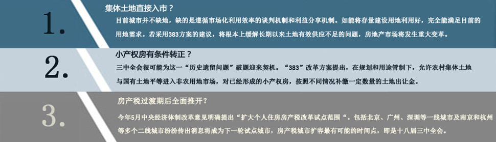 | 隨著十八屆三中全會的臨近,國務(wù)院發(fā)展研究中心專家的“383報告”引起熱議。 具體到房地產(chǎn)領(lǐng)域,“383方案”中共提到土地改革、小產(chǎn)權(quán)房、金融改革以及房產(chǎn)稅三個方面,與近期業(yè)內(nèi)討論很多的房地產(chǎn)長效調(diào)控機(jī)制相關(guān)。 "土改"將成新的突破點(diǎn),為樓市變革指明新的方向。 [詳細(xì)] |