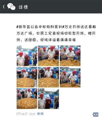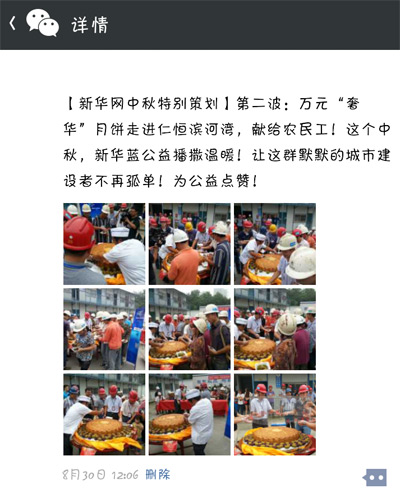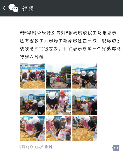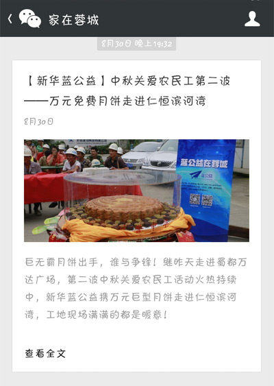 為了給這些身在異鄉(xiāng)的農(nóng)民工兄弟送去溫暖,新華藍公益特別為他們舉辦了一場“中秋關愛農(nóng)民工特別活動”,現(xiàn)場為工人捐贈月餅。8月29日上午10:30,本次活動在成都沙灣會展中心如期啟動。