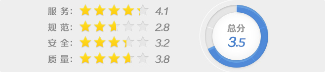 3、通過(guò)問(wèn)卷調(diào)查結(jié)果分析,金隅項(xiàng)目總分共3.5星,服務(wù)等級(jí)為4.1星,安全等級(jí)為3.2星,規(guī)范等級(jí)為2.8星,質(zhì)量等級(jí)為3.8星。