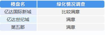 根據(jù)上表可以看出:調(diào)查問(wèn)卷中的三個(gè)項(xiàng)目,居民對(duì)小區(qū)綠化都表示滿意,記者在走訪調(diào)查中發(fā)現(xiàn),億達(dá)多個(gè)小區(qū)整體環(huán)境干凈、整齊,規(guī)劃很合理,以普通住宅區(qū)的標(biāo)準(zhǔn)來(lái)衡量,其綠化率、植物種類等算是超過(guò)同類標(biāo)準(zhǔn)。