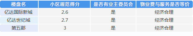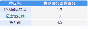 在物業(yè)服務(wù)調(diào)查過(guò)程中,第五郡分?jǐn)?shù)最高為4.5分,億達(dá)國(guó)際新城得分最低,為1.7分。