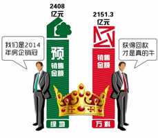 同樣位列榜單TOP10的萬科,今年12月萬科實現(xiàn)銷售面積206.8萬平方米,銷售金額250.3億元,同比分別增112.0%和128.7%。2014年全年累計實現(xiàn)銷售面積1806.4萬平方米,銷售金額2151.3億元,分別比2013年同期增21.1%和 25.9%。