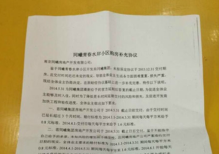 2013年6月買房,合同約定2013年12月31日前交付,已經(jīng)過去7個月,卻至今未拿到房子——這樣的事情就發(fā)生在江寧同曦青春水岸的業(yè)主身上。業(yè)主張女士和許先生告訴新華網(wǎng)記者,跟他們一樣簽訂去年底交付的青春水岸4、5、6三幢樓的近400戶業(yè)主,直到現(xiàn)在全都沒能拿到房子。