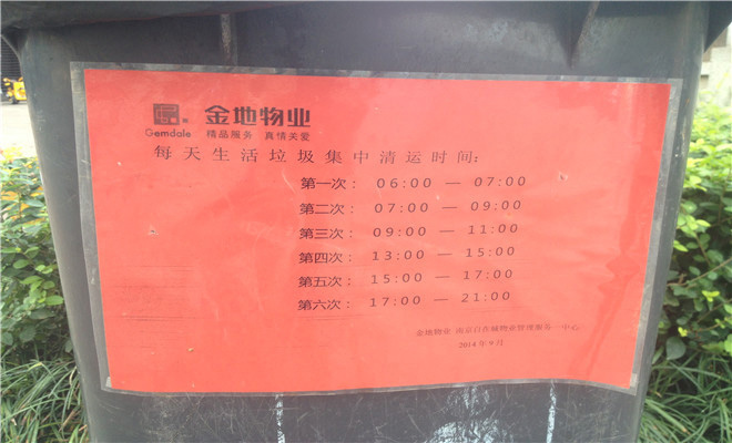 物業(yè)服務(wù)方面業(yè)主總體表示很滿意,其中一位陳姓業(yè)主告訴記者:“小區(qū)內(nèi)定期會有專人進行綠化養(yǎng)護和衛(wèi)生保潔,環(huán)境非常好?!蓖瑫r,記者還發(fā)現(xiàn)基本上小區(qū)內(nèi)垃圾桶上都貼有明確的每日清運時間,非常人性化。