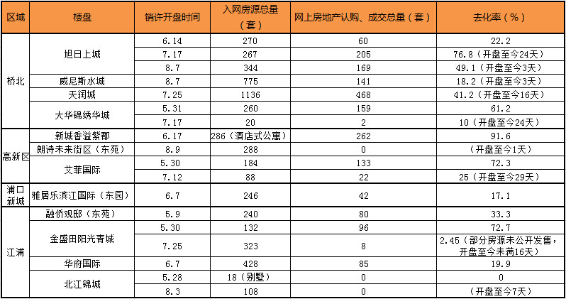 新華網(wǎng)記者將目前六合、大廠區(qū)域在售的9家熱點樓盤,5、6、7三個月內(nèi)的12次開盤納入統(tǒng)計范疇,結(jié)果發(fā)現(xiàn),其中6家樓盤的7次推售,已持續(xù)一個月時間,但去化率不足50%。[詳細(xì)]