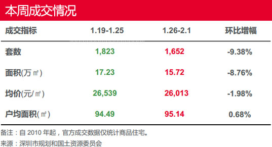 本周(1.26-2.1)一手樓成交價量齊跌,成交套數(shù)及成交面積環(huán)比跌幅均接近一成;全市成交均價微跌1.98%。