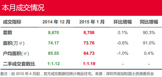 1月住宅成交仍舊處于高位,繼2014年最后一個月突破7000套后保持7000套以上記錄(自2009年07月以來),成交面積約70萬平方米,環(huán)比跌6.0%,成交面積跌10.7%,成交均價微漲3.6%;同比成交套數(shù)漲2.9倍,成交面積漲3.1倍,成交均價漲22.7%。