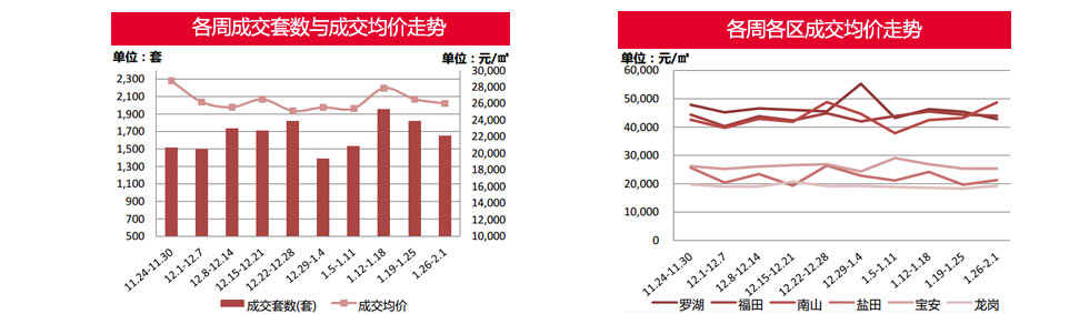 本周(1.26-2.1)除羅湖、福田兩區(qū)成交均價下跌外,其余各區(qū)有不同程度上漲,其中羅湖跌5.57%、福田跌0.77%;南山漲 12.64%、鹽田漲8.3%、龍崗漲4.93%、寶安漲0.02%。
