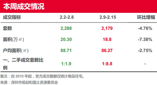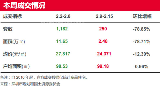 由于春節(jié)假期將至,并且本周(2.9-2.15)無新盤入市,深圳一手住宅成交套數(shù)及成交面積下跌均接近八成;成交均價下跌超一成。
