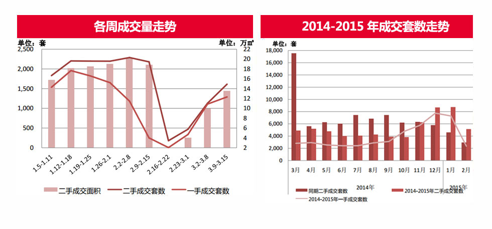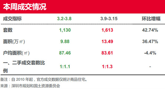 受兩會期間房地產(chǎn)利好風(fēng)向標(biāo)的影響,三月成交 持續(xù)升溫,本周(3.9-3.15)成交套數(shù)環(huán)比上漲16.53%,成交面積環(huán)比上漲15.03%;成交均價(jià)跌6.88%。