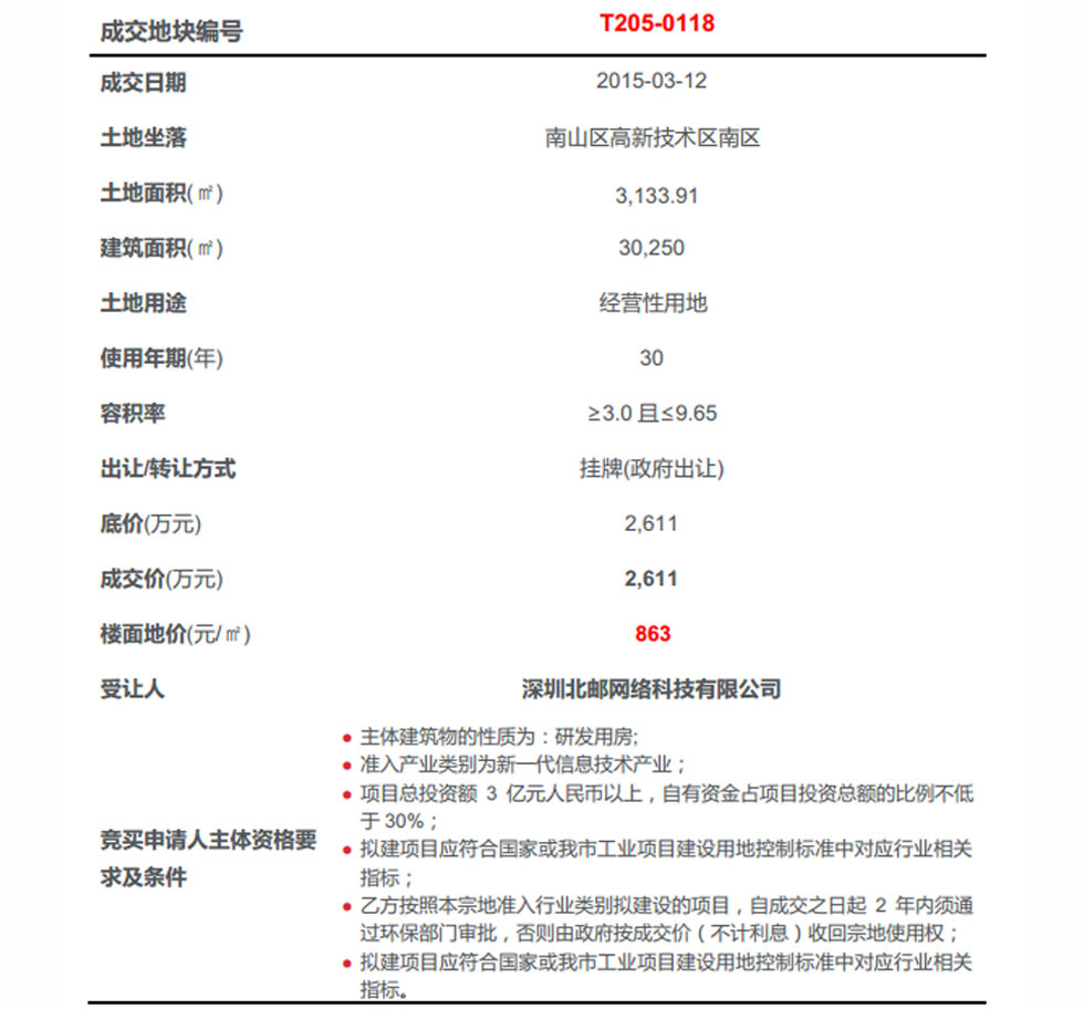 本周(3.9-3.15)成功出讓1宗經(jīng)營性用地,由深圳北郵網(wǎng)絡(luò)科技有限公司以底價(jià)成交。