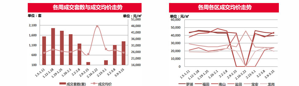 本周(3.9-3.15)南山、鹽田、羅湖三區(qū)成交均價(jià)呈上漲趨勢,其中南山漲15.85%、鹽田漲14.77%、羅湖微漲2.34%;其余各區(qū)成交均價(jià)有不同程度下跌,其中龍崗跌19.27%、福田微跌2.46%,寶安基本持平。