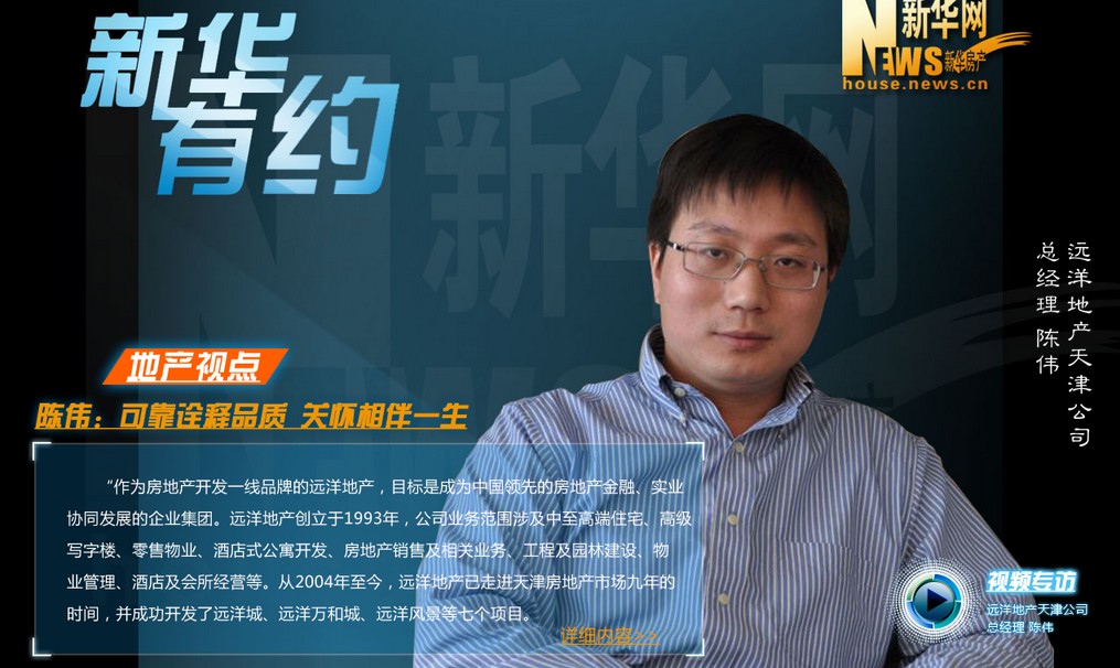 作為房地產(chǎn)開發(fā)一線品牌的遠(yuǎn)洋地產(chǎn),目標(biāo)是成為中國(guó)領(lǐng)先的房地產(chǎn)金融、實(shí)業(yè)協(xié)同發(fā)展的企業(yè)集團(tuán)。遠(yuǎn)2004年至今,遠(yuǎn)洋地產(chǎn)已走進(jìn)天津房地產(chǎn)市場(chǎng)九年的,并成功開發(fā)了遠(yuǎn)洋城、遠(yuǎn)洋萬和城、遠(yuǎn)洋風(fēng)景等七個(gè)項(xiàng)目。新華網(wǎng)新華房產(chǎn)榮幸的邀請(qǐng)到遠(yuǎn)洋地產(chǎn)天津公司總經(jīng)理陳偉,共同分享遠(yuǎn)洋地產(chǎn)在天津的成長(zhǎng)之路。