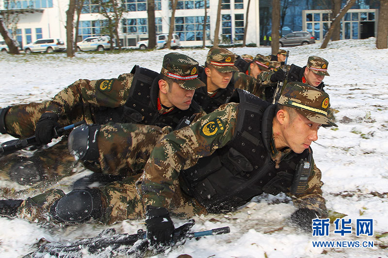 防暴隊隊員在雪地上開展戰(zhàn)術訓練