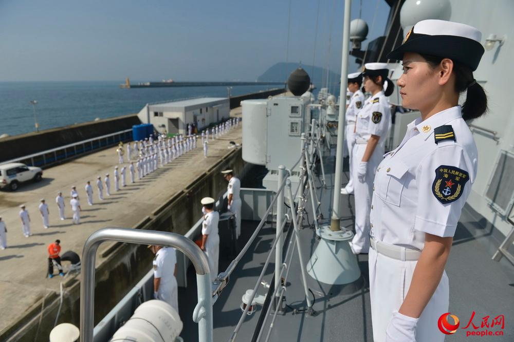 大慶艦靠釜山碼頭時艦艇女兵整齊列隊。張海龍攝