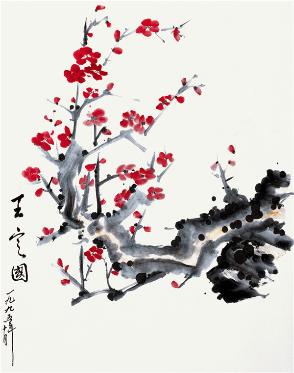 王定國畫梅,枝干是撒上墨吹出來的,花瓣才是畫上去的。一吹一畫,別有風韻??此鳟嫞P尖過處,朵朵紅梅栩栩如生,鮮紅艷麗,如火似霞。細看這些紅梅,雖大小形態(tài)各異,但都朝著一個方向,那是太陽的方向。