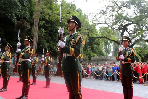 ????每周一清晨,當?shù)谝豢|陽光灑照在中越界碑的時候,伴著嘹亮的國歌,友誼關國旗護衛(wèi)隊隊員邁著矯健的步伐,將鮮艷的五星紅旗緩緩升上千古雄關友誼關關樓的上空……【詳細】