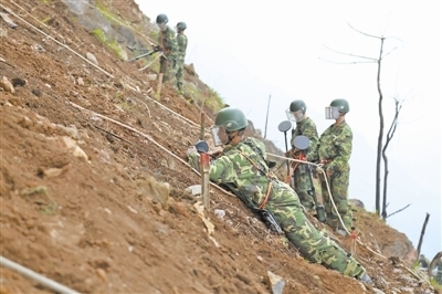 30余名官兵身著數(shù)十斤重的迷彩防護服,腰系白色安全繩,右手持探雷器,左手抓繩,像城市高樓間的“蜘蛛人”一般,在近乎垂直的山坡上進行人工搜排作業(yè)。隨著金屬探雷器報警聲不斷,官兵們反復掃描確認,再抽出探雷針,向土里輕輕捅扎,確認地雷位置、大小、類型,插上小紅旗標識……