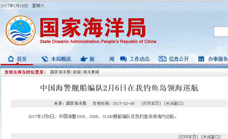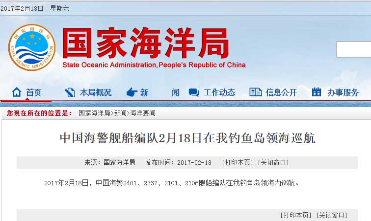 新華網(wǎng)北京2月18日電 據(jù)國家海洋局網(wǎng)站報(bào)道,2017年2月18日,中國海警2401、2337、2101、2106艦船編隊(duì)在我釣魚島領(lǐng)海內(nèi)巡航。