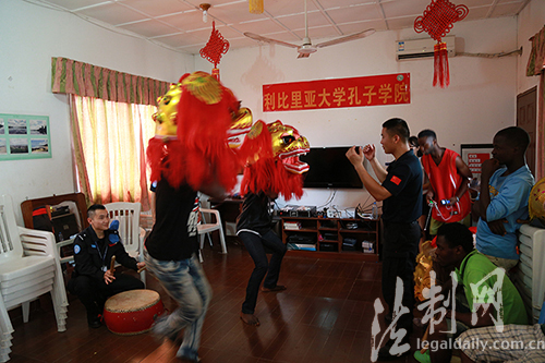 ????利比里亞時間4月23日,中國第五支駐利比里亞維和警察防暴隊應邀到利比里亞大學孔子學院開展文化交流活動,并進行舞獅指導。