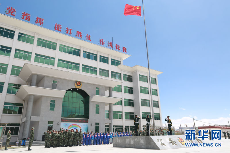 “孔繁森”小學(xué)困難兒童與邊防官兵一同參加升國(guó)旗儀式。張拴根 攝