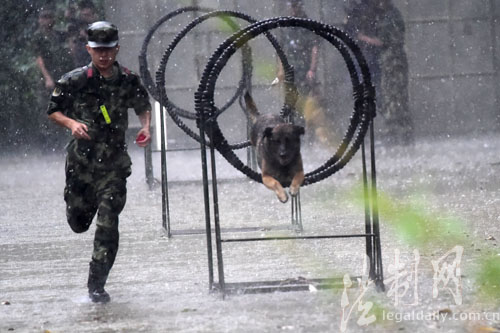 圖為訓(xùn)導(dǎo)員方加林與警犬道海在暴雨中進(jìn)行穿越障礙訓(xùn)練