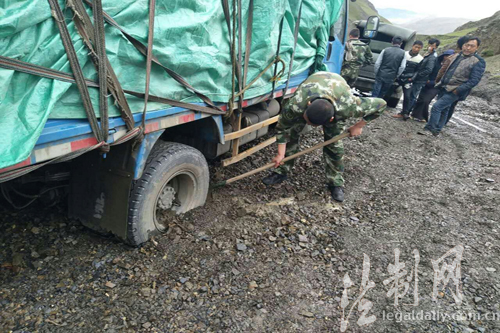????連日來,受強降雨天氣影響,通往西藏山南市錯那縣卡達鄉(xiāng)道路因山體塌方和泥石流損毀嚴重,7月23日中午12時,西藏邊防總隊山南邊防支隊卡達邊防派出所接轄區(qū)居民電話報警稱:商店運貨貨車在返回卡達鄉(xiāng)途中陷入泥潭,請求派出所救援。接到消息后,該所迅速組織官兵趕往現(xiàn)場,并持續(xù)關注道路情況和受困狀況。到達現(xiàn)場后,邊防官兵立即展開救援,用十字鎬挖、用手刨、用人推,經(jīng)過2個小時的不懈努力,最終成功把陷入泥坑的貨車拉出。救援結束后,邊防官兵就近取材把泥坑填平,并設立警示標志,確保后續(xù)車輛順利通過。現(xiàn)場無人員受傷,車輛完好。