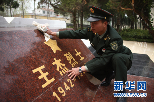 “王杰班”第29任班長(zhǎng)劉佳玉擦拭王杰烈士紀(jì)念碑(2014年4月3日攝)。新華社發(fā)(趙聰 攝)