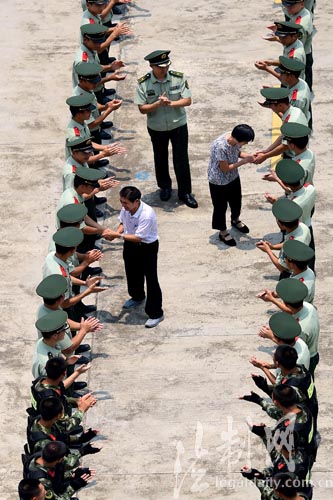 圖為官兵們夾道歡迎梅開(kāi)春父母來(lái)隊(duì)