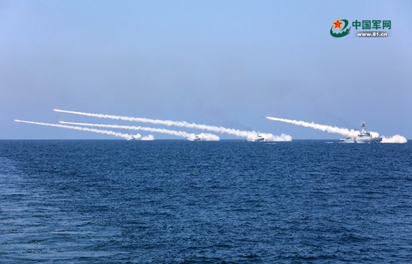8月7日,海軍在黃海、渤海相關(guān)??沼蚪M織實(shí)兵實(shí)彈對(duì)抗演習(xí),最大限度檢驗(yàn)體系作戰(zhàn)能力、戰(zhàn)法訓(xùn)法、武器裝備效能,共實(shí)射各型導(dǎo)彈數(shù)十枚。這是水面艦艇齊射反艦導(dǎo)彈。李唐 攝(圖片來(lái)源:中國(guó)軍網(wǎng))