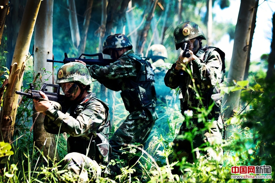邊防官兵三人為一個小組,開展叢林搜捕警戒。余杉芳 攝