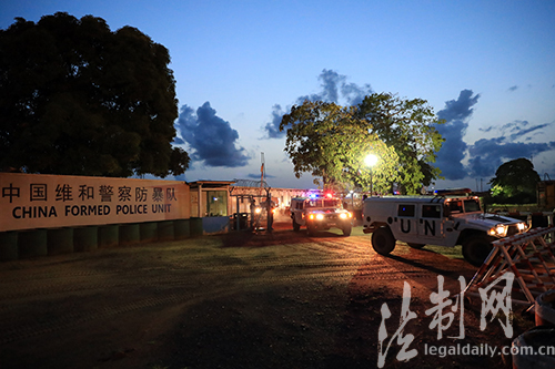 圖為天色漸暗,中國維和警察防暴隊(duì)巡邏組乘車駛出營區(qū)