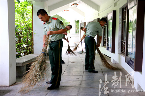 圖為臨退老兵到駐地社區(qū)公共場所義務(wù)勞動(dòng)