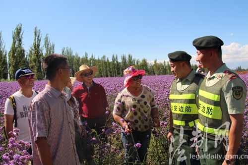 ????每年6月、7月,數萬畝薰衣草爭相怒放,匯成一片紫色的海洋,吸引大量游客前去觀賞。新疆公安邊防總隊伊犁邊防支隊梁三宮邊防派出所官兵因地制宜打造“紫郁之鄉(xiāng)110”這一特色警務,在治安防控、服務群眾、素質提升等方面走出了一條新路子,用使命、責任與情感為游客保駕護航,讓游客享受一趟“滿意之旅”。