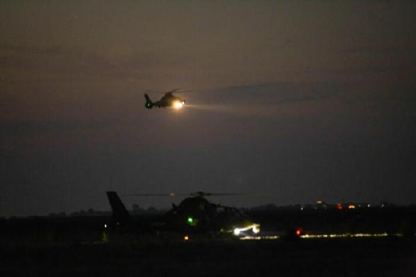 ????夜間,多架多型號(hào)武裝直升機(jī)帶彈起飛(4月18日攝)。