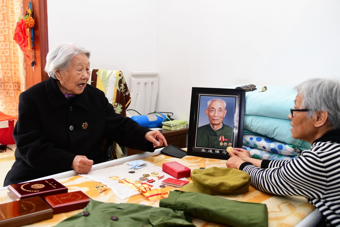 婁淑珍(左)與女兒一起整理周智夫獲得的榮譽(yù)章。新華社記者 張永進(jìn) 攝