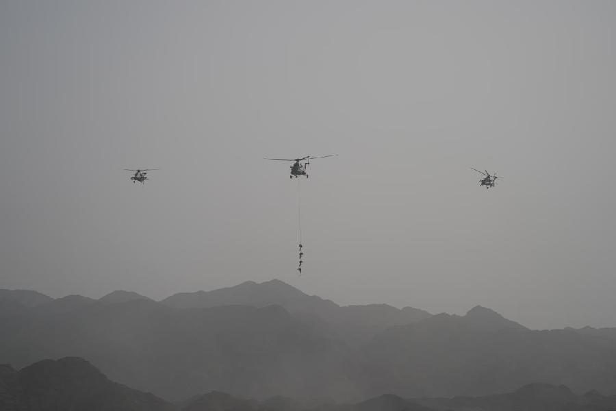 ????23日清晨,荒山丘陵遍布的庫爾勒訓練基地,某特戰(zhàn)旅特戰(zhàn)分隊乘坐直升機迅速向“恐怖分子”的營地機動,演練的第一個課目就這樣毫無征兆地打響。