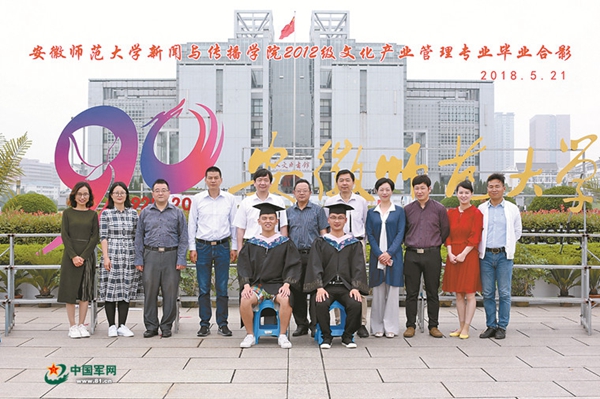 5月21日,安徽師范大學新聞與傳播學院組織應屆畢業(yè)生拍攝畢業(yè)照,眾多班級的學生依次排隊拍攝,其中一個班級與眾不同——只有兩名學生,而與他倆合影的卻有11名老師。并且,11名老師站在后排,兩名學生坐在前排。當相機的快門摁下之后,這張照片成為該校濃厚尊崇軍人氛圍的亮麗名片。