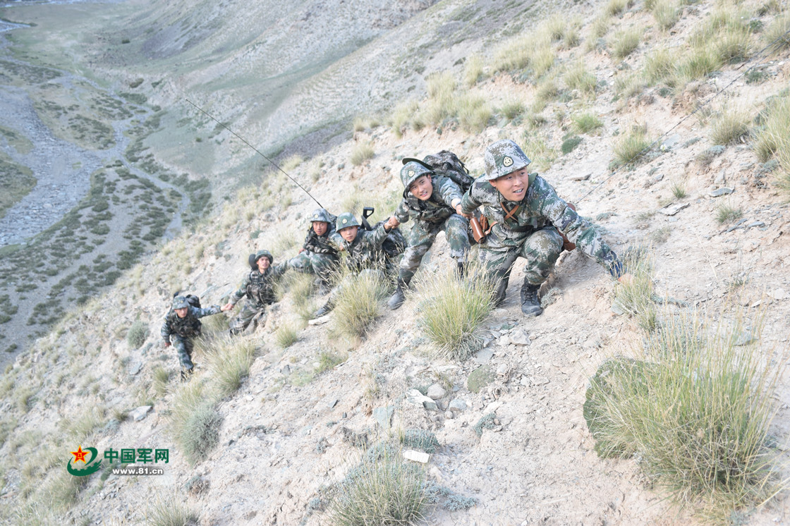 在高達60多度的陡坡上,新戰(zhàn)士手拉手,分批次翻越窮鐵列克達坂。嚴曉春攝