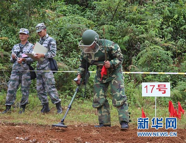 參訓(xùn)官兵到麻栗坡某綜合訓(xùn)練場(chǎng)進(jìn)行探雷器操作使用考核(8月31日攝)。 新華社發(fā)(張輝 攝)